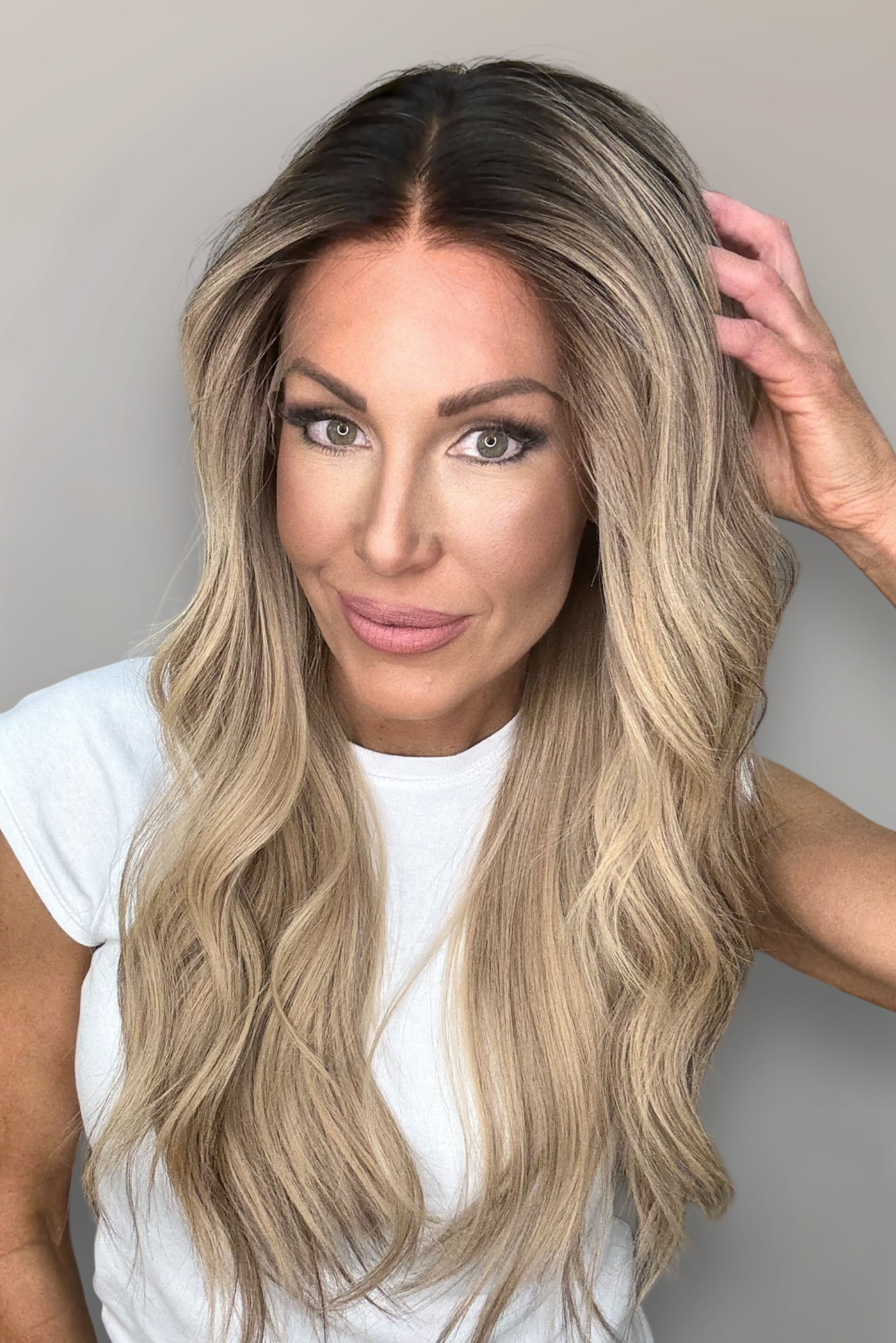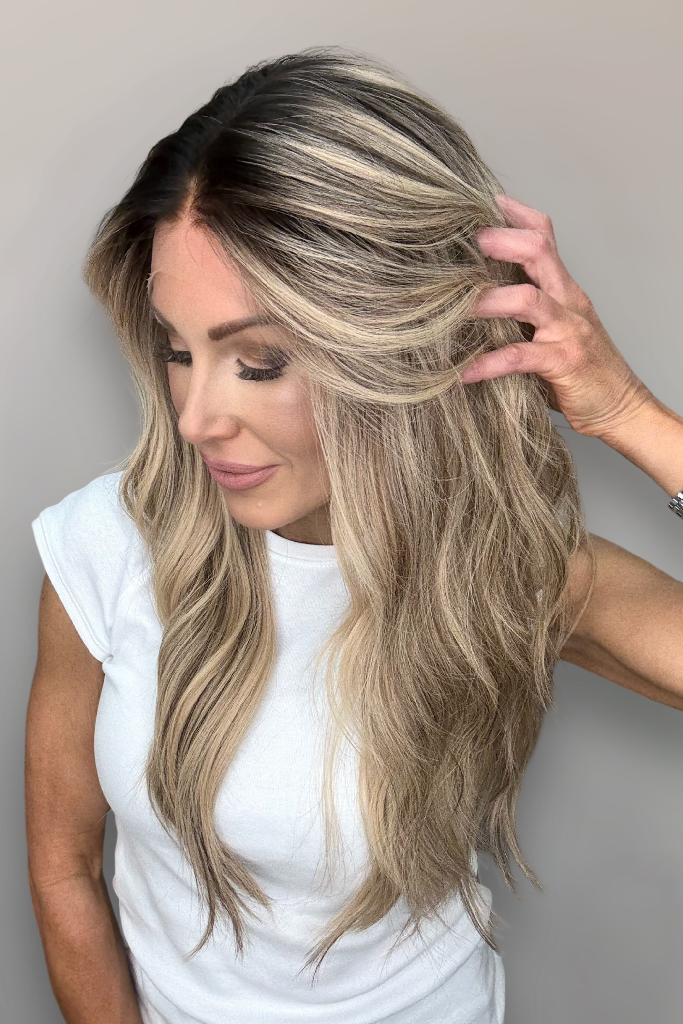 Level: Deep Level 3 Root and Level 6/7 Lowlights, Warm Level 9 Ends and Money Pieces (Level Scale- level 1 is darkest black; level 10 is lightest blonde)