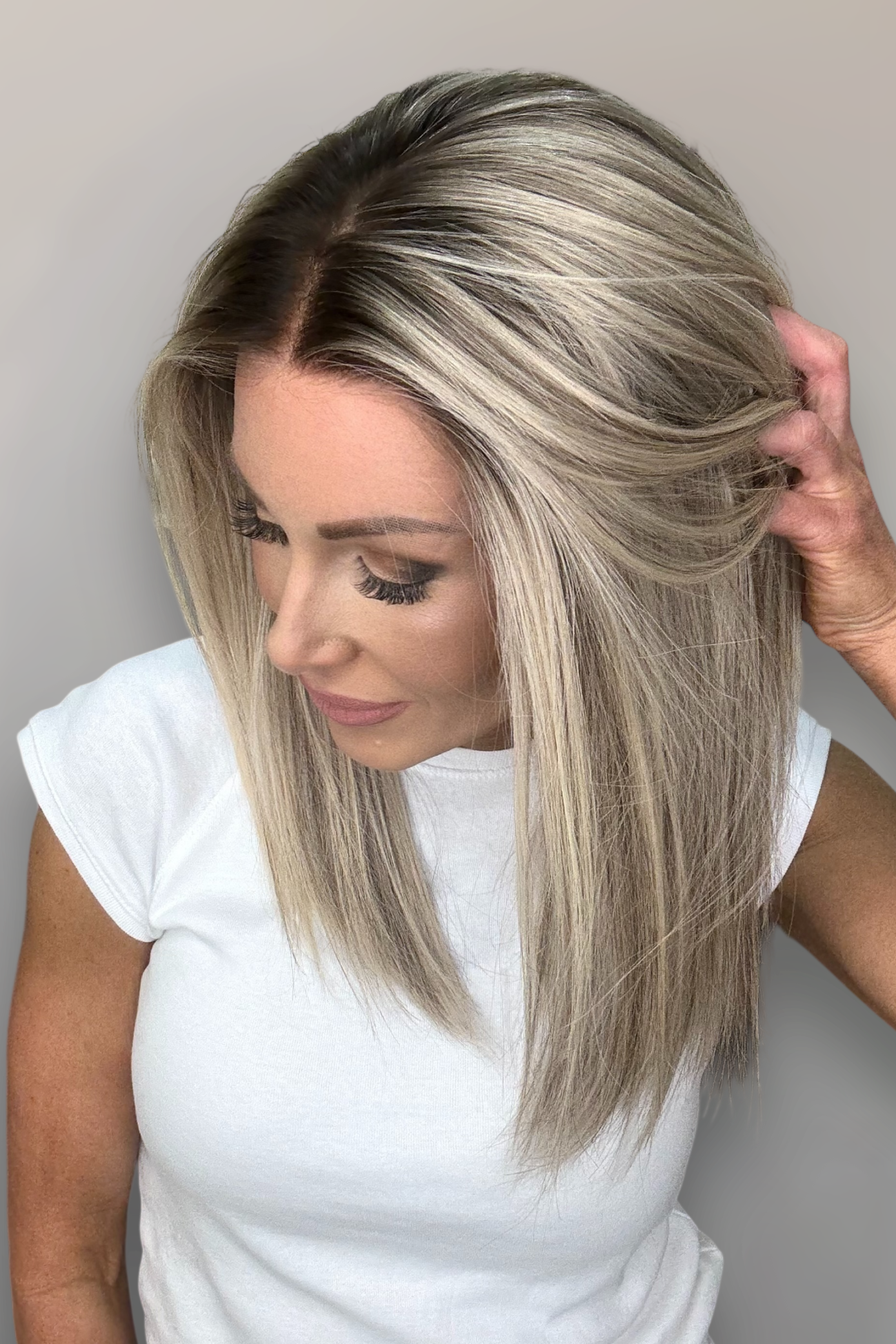 Level: Neutral Level 5 Root with Level 6 Lowlights, Level 10 highlights and Money Pieces (Level Scale- level 1 is darkest black; level 10 is lightest blonde)