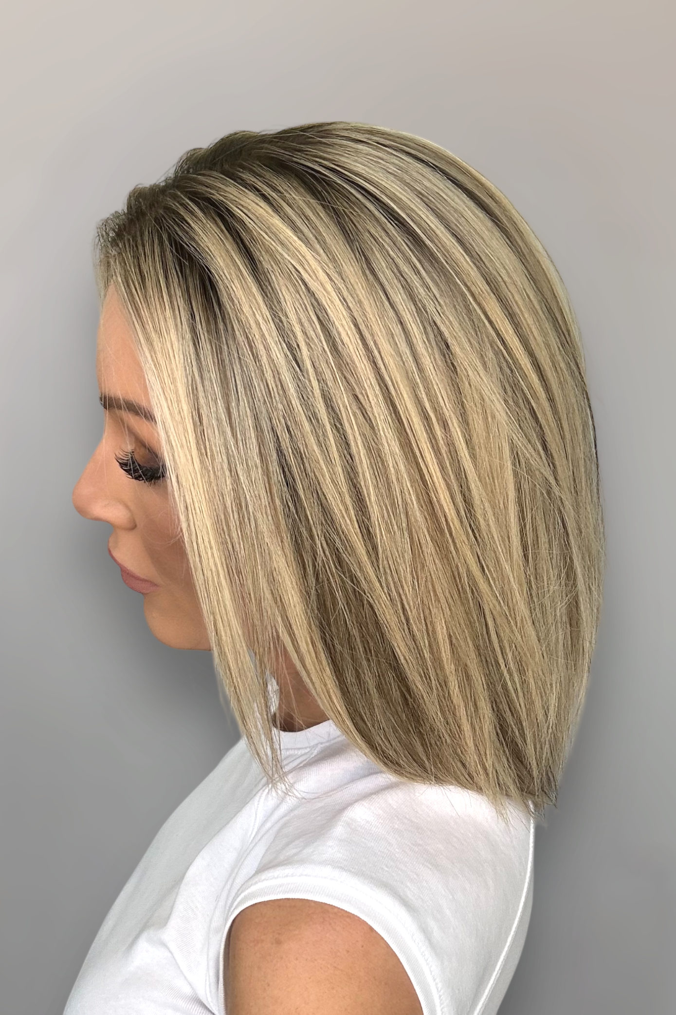 Level: Neutral Level 5 Root with Level 6 Lowlights, Level 10 highlights and Money Pieces (Level Scale- level 1 is darkest black; level 10 is lightest blonde)
