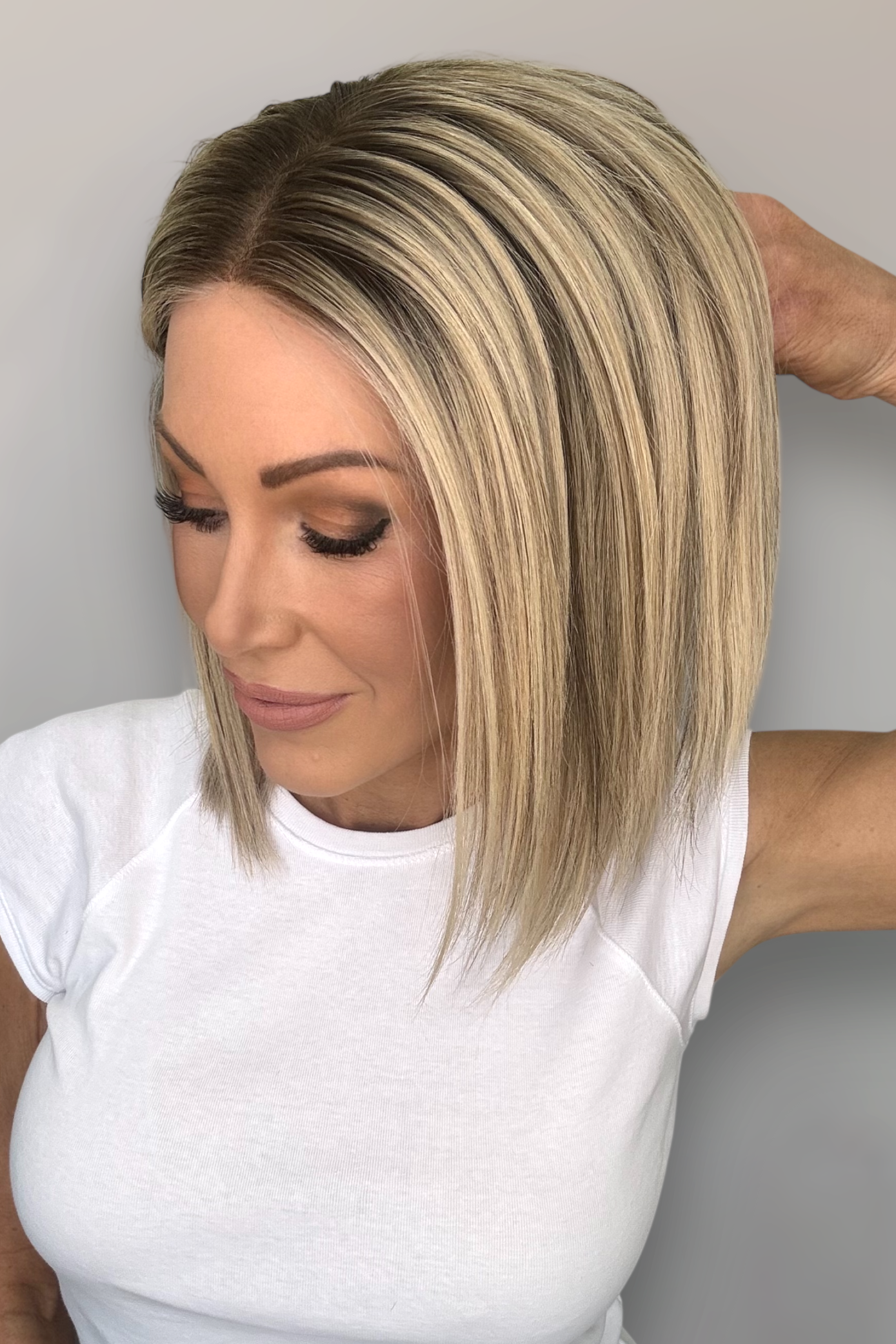 A wig is full coverage and will cover your entire head. A topper is partial coverage and is typically worn utilizing your biological hair at the nape and hairline. Think of a topper like a men’s “toupee” (but more fabulous, of course!) Toppers should be about the same or similar color as your bio hair since it’s only partial coverage, and should be about the same length or just a few inches longer. A wig can be any color or length since it’s full coverage, and doesn’t need to blend with your bio hair.