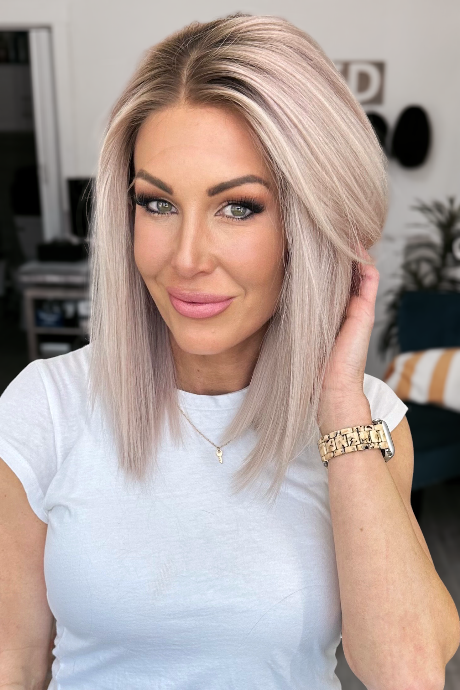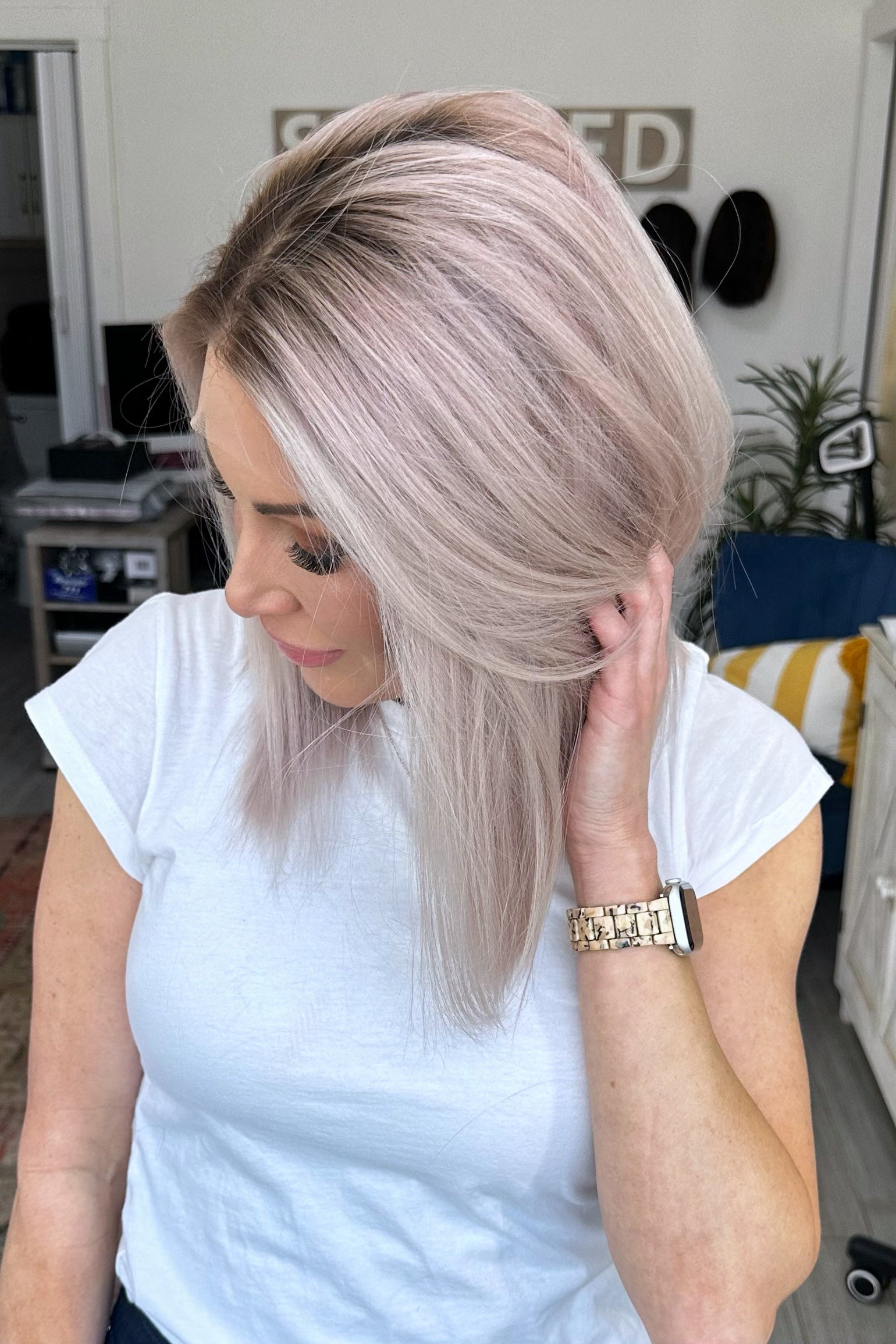 Level: Neutral Level 6 Root Transitioning to Level 8 Pink Tones and Level 10 White Blonde Base (Level Scale- level 1 is darkest black; level 10 is lightest blonde)