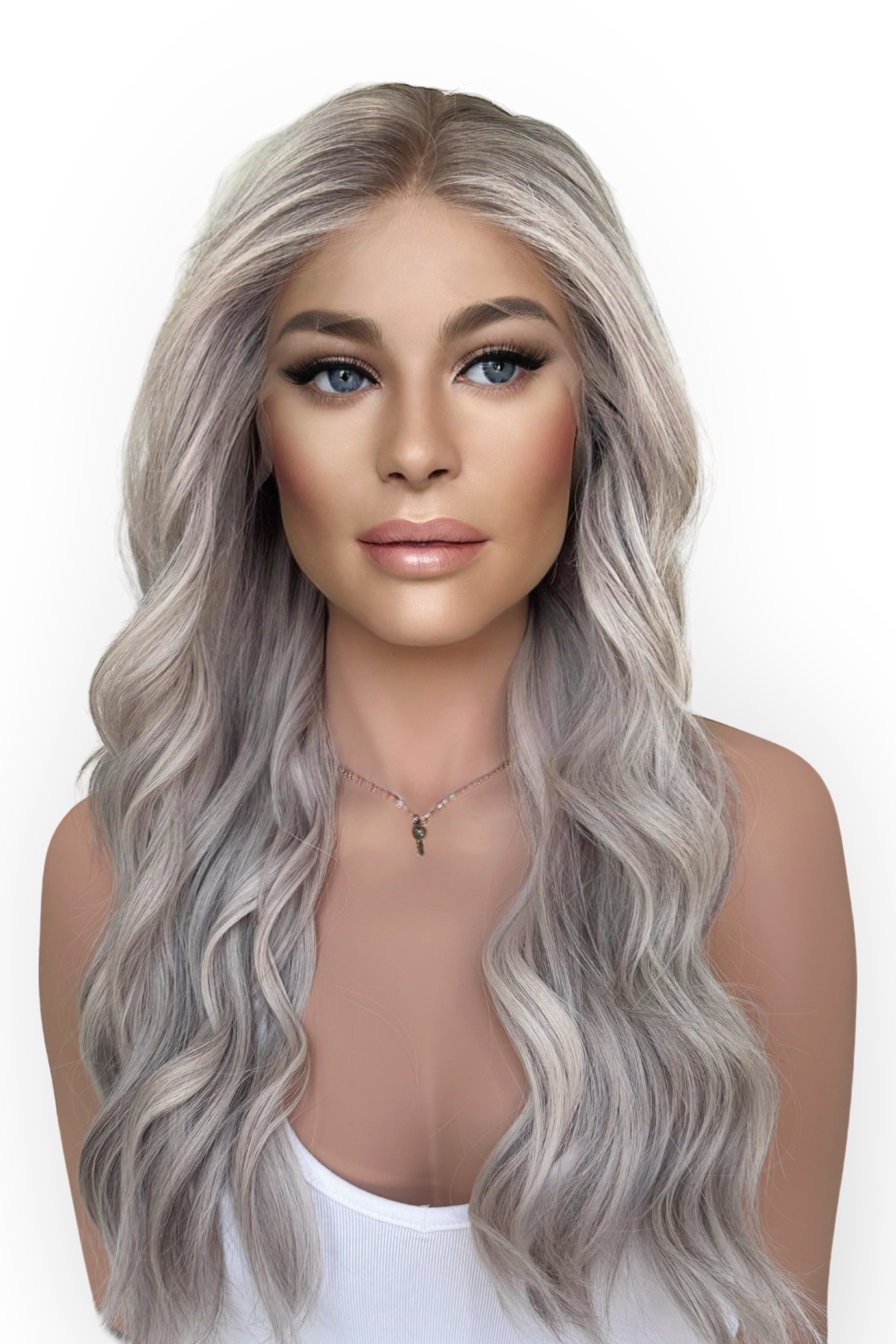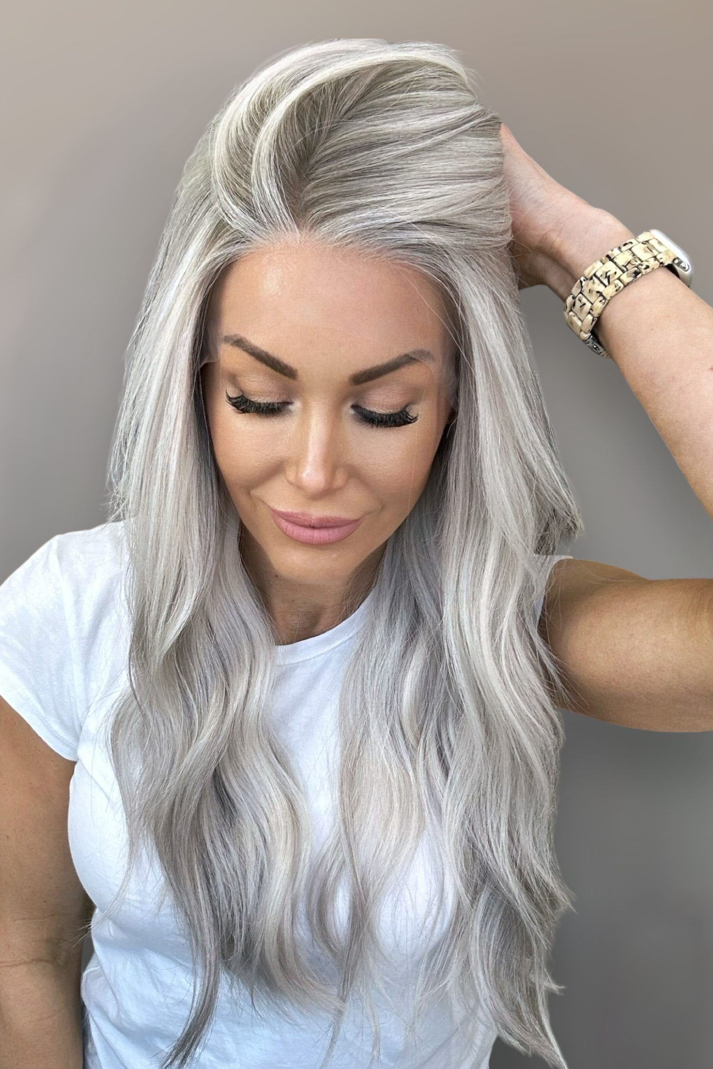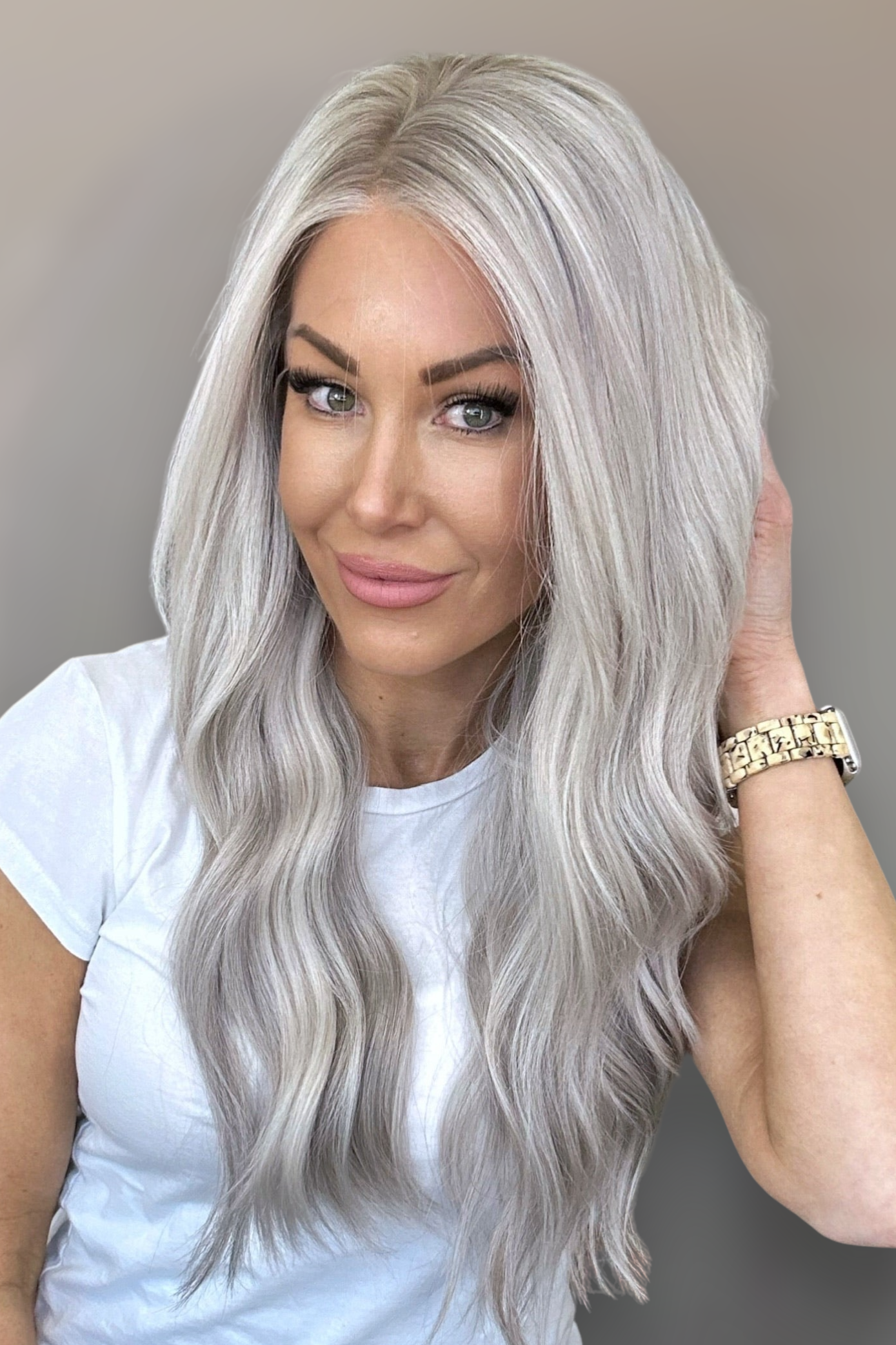 Level: Cool Level 8 Ash Grey Shadow Root and Lowlights, Level 10 Money Pieces and Ends. (Level Scale- level 1 is darkest black; level 10 is lightest blonde)